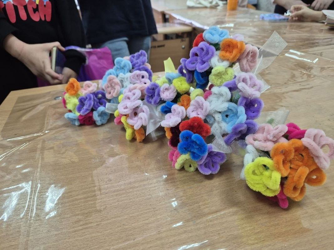 Ребята с большим старанием и интересом осваивали технику: подбирали цвета, аккуратно формировали лепестки и стебли, учились сочетать оттенки и собирать композиции. В каждый цветок дети вложили внимание, терпение и частичку своего настроения — поэтому букеты получились по-настоящему яркими, нежными и неповторимыми.